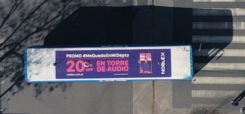 La marca y la agencia pensaron la acción #MeQuedoEnMiDepto. Por ello se pueden ver importantes descuentos de Noblex anunciados únicamente en los techos de los colectivos que circulan por la Ciudad de Buenos Aires y que solo se ven desde arriba.
